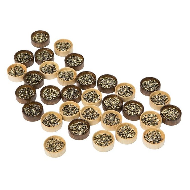 Этот набор представляет собой произведение искусства – тут все выполнено вручную из натурального орехового дерева. Оно очень прочное и выдержит любые удары, даже при быстрой игре. Можете не беспокоиться за свою доску, т.к. к фишкам с нижней стороны приклеена тканевая подложка, которая обеспечивает мягкое скольжение и не позволит появиться царапинам и трещинам. Сверху из бронзы вручную вырезан российский герб, что придает фишкам уникальности и богатый внешний вид.